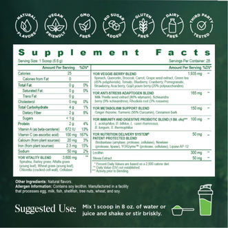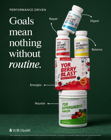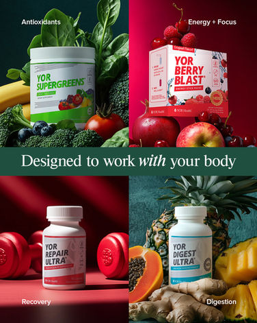 The palette was also designed to scale across the full product line. The green system owns SuperGreens as the hero SKU, but the architecture has product-specific accent flexibility built in. YOR Berry Blast pulls a red accent that sits naturally alongside the forest palette, giving that product its own identity while staying unmistakably YOR Health.